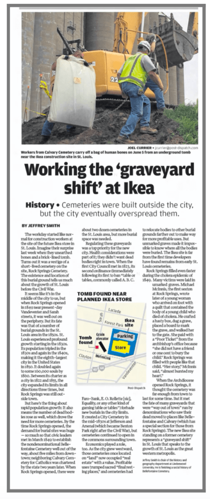 St. Louis City is still changing in many ways. In 2014 when Ikea was built construction crews dug up the remains of someone lost when the original graveyard was moved to Calvary. It was made very clear that no excavation would be done to search for any more potential graves, because that would halt progress. Consequently, Ikea might sit on top of more unmarked, forgotten graves. Historians, preservationist, and archaeologist tried to push back and argue the importance of searching for these lost graves. But what can they do? What can we do when the greater public seems oblivious to the memory or memorialization at a historic site or in the case of Ikea, when big business sees the very act of memorialization as a threat to progress?