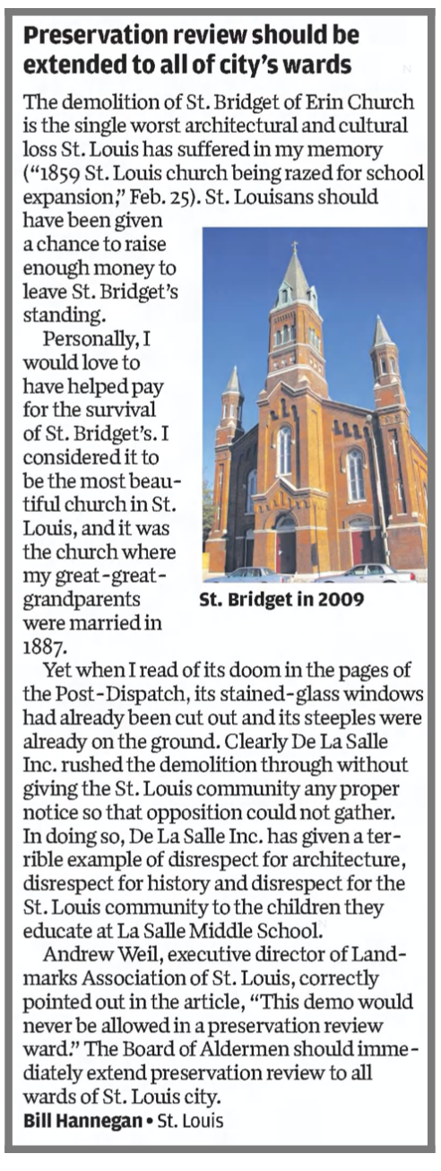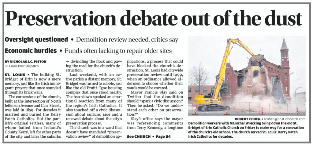 St. Bridget of Erin was not in an area that had a preservation review board. City-wide preservation review was the staple in St. Louis until 1999, “when an ordinance allowed aldermen to choose whether their wards would be covered.”
