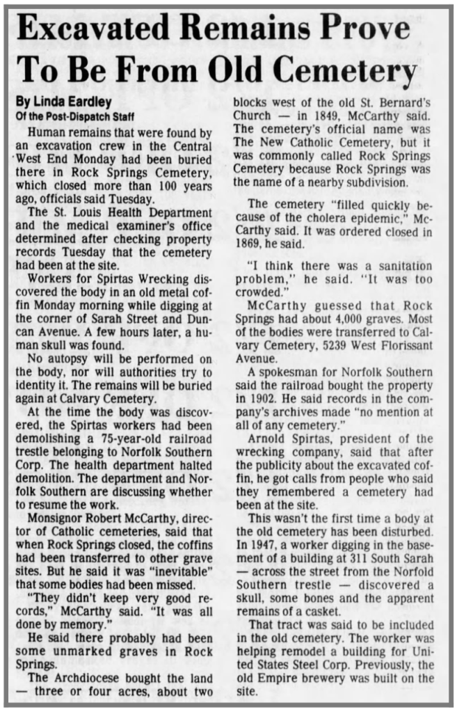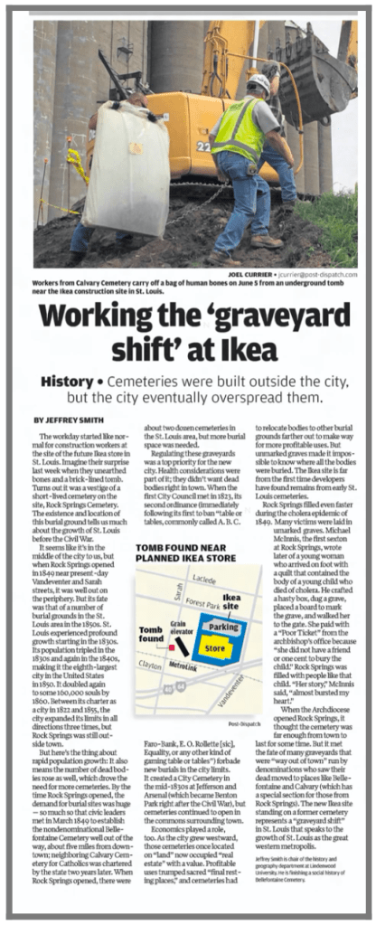 The motivation behind these situations is that the very existence of these historic sites hindered progress for the living. How accurate is that? When Rock Springs and Second Catholic were relocated, it is easy to see how they were moved to help St. Louis as a city grew, battled epidemics, and faced growing environmental concerns. City limits have been established for years now, so who benefits from the expansion of Highway 70, Ikea, and a vacant lot?