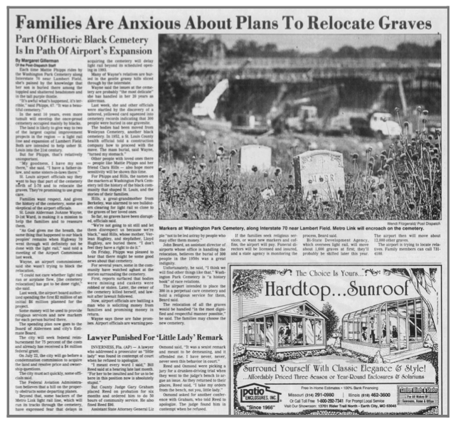 Four different construction projects; expansions of highway 70, Lambert airport, and MetroLink chipped away at Washington Park Cemetery. The result was the misplacement of many African American remains that, to this day, their whereabouts are unknown.